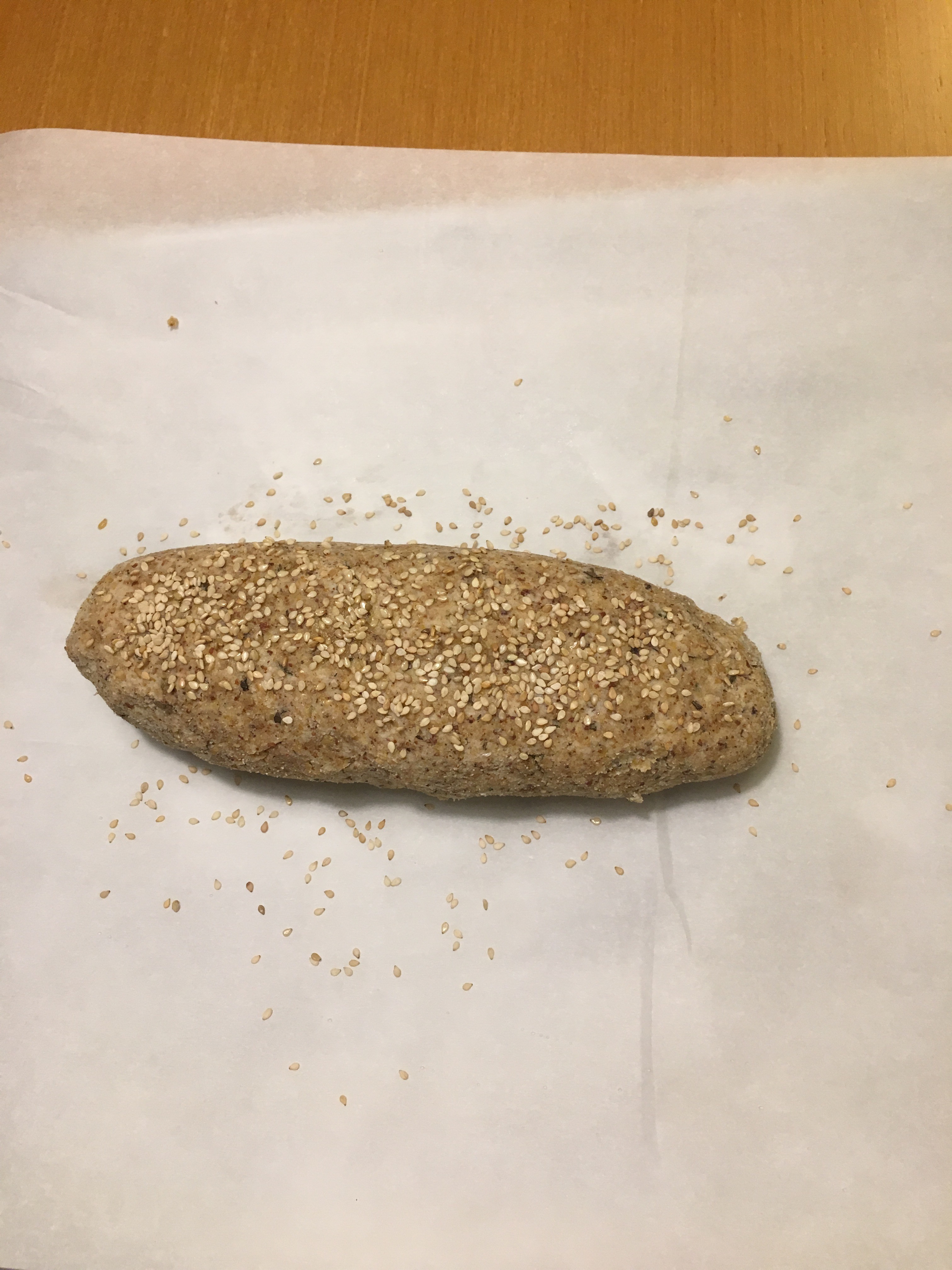 Formar um pão e colocar no tabuleiro de forno forrado com papel vegetal. Colocar sementes por cima.