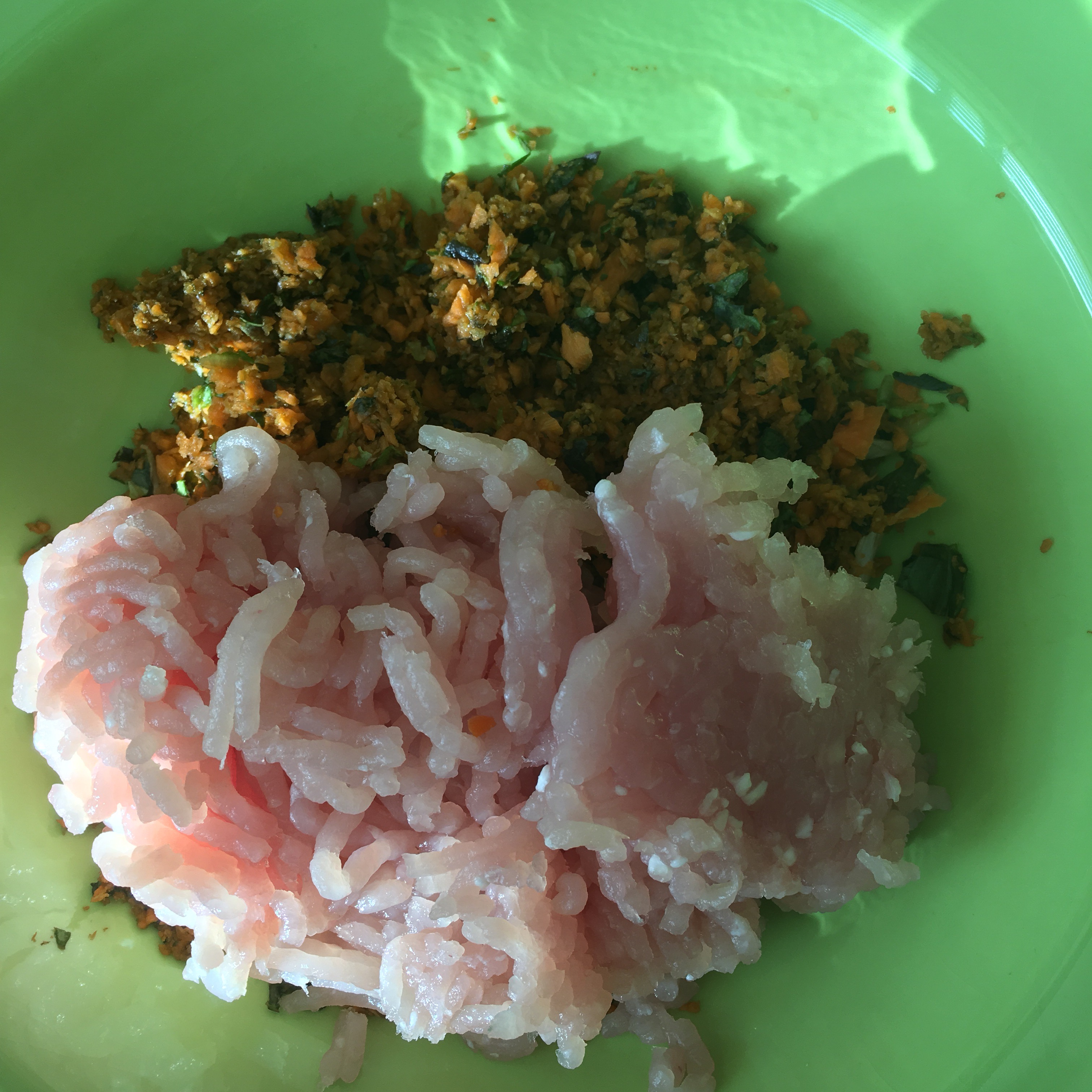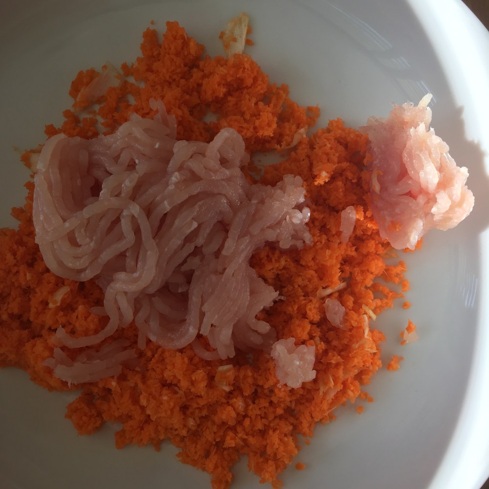 Distribuir a carne por duas taças. Numa juntei uma cenoura ralada e o alho francês. Na outra a outra cenoura ralada e a alface picada.