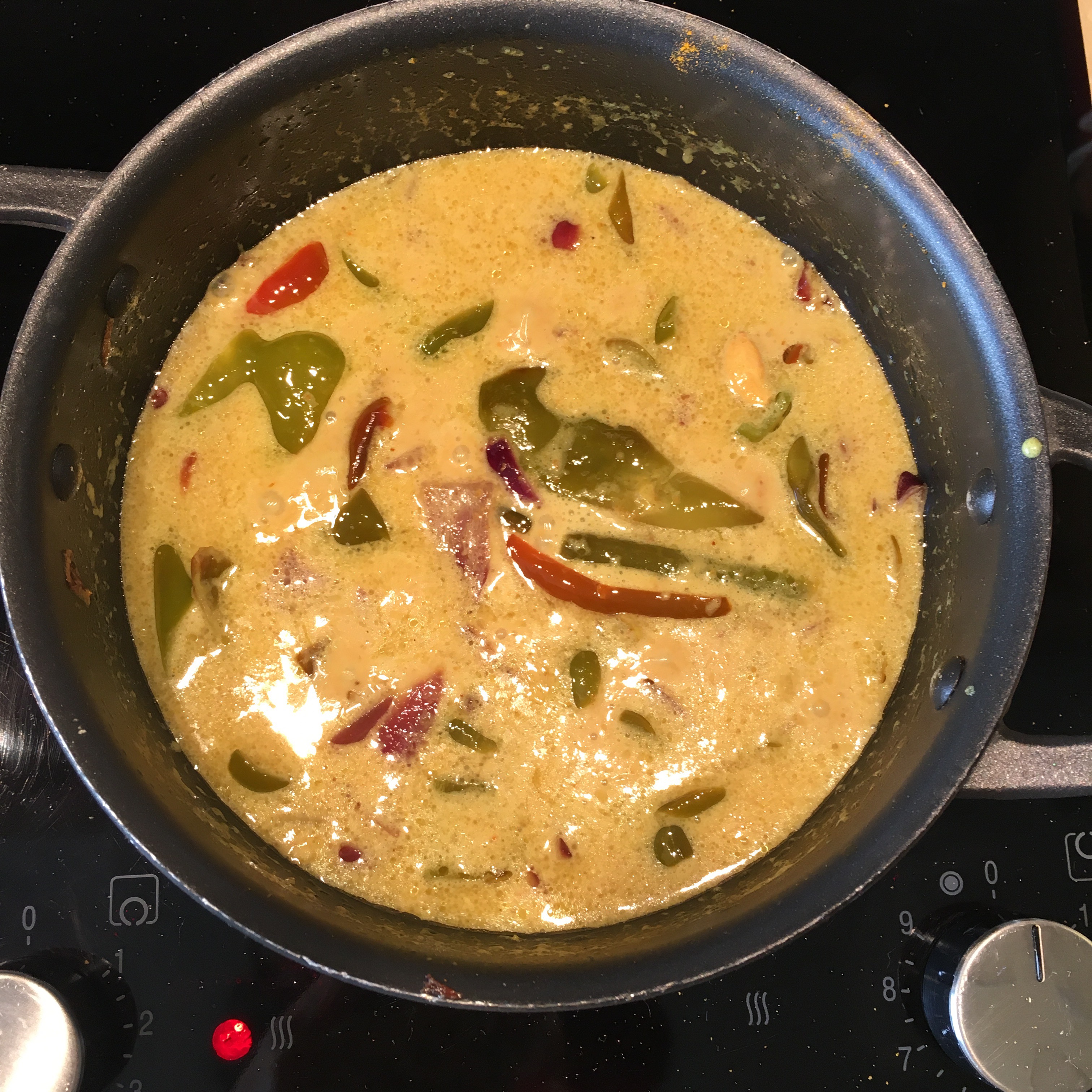 A regra de ouro é que nunca nada se perde e tudo se transforma! Abri o congelador e tinha pimentos congelados arranjados e restos de legumes assados no forno. E vamos lá preparar um caril (que desapareceu num ápice).
