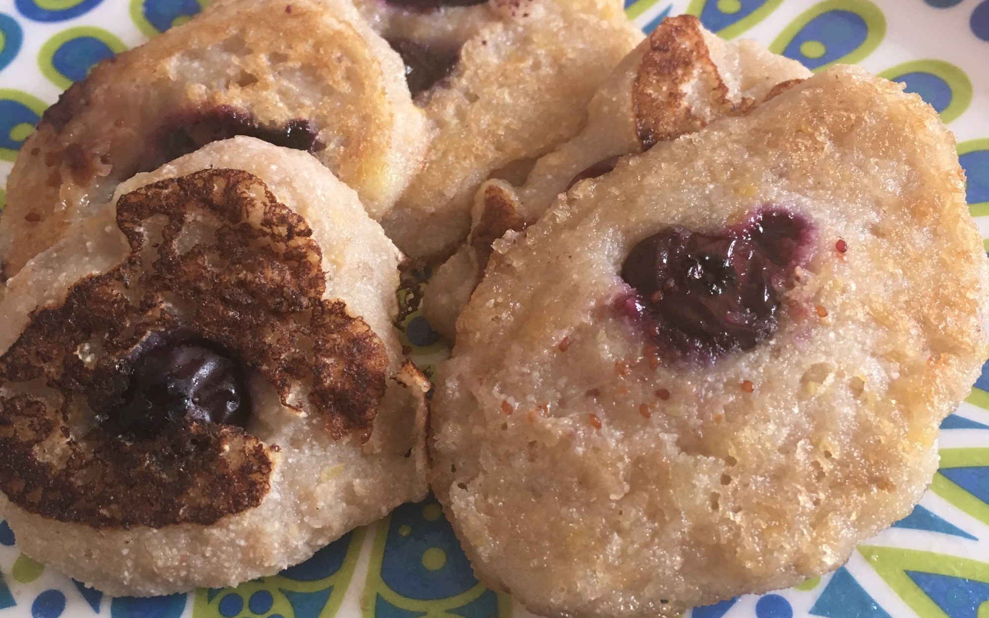 Juntar todos os ingredientes. Fazer as mini panquecas numa frigideira anti-aderente com um pouco de óleo de côco. Antes de virar coloco um mirtilo esmagado em cima da massa.