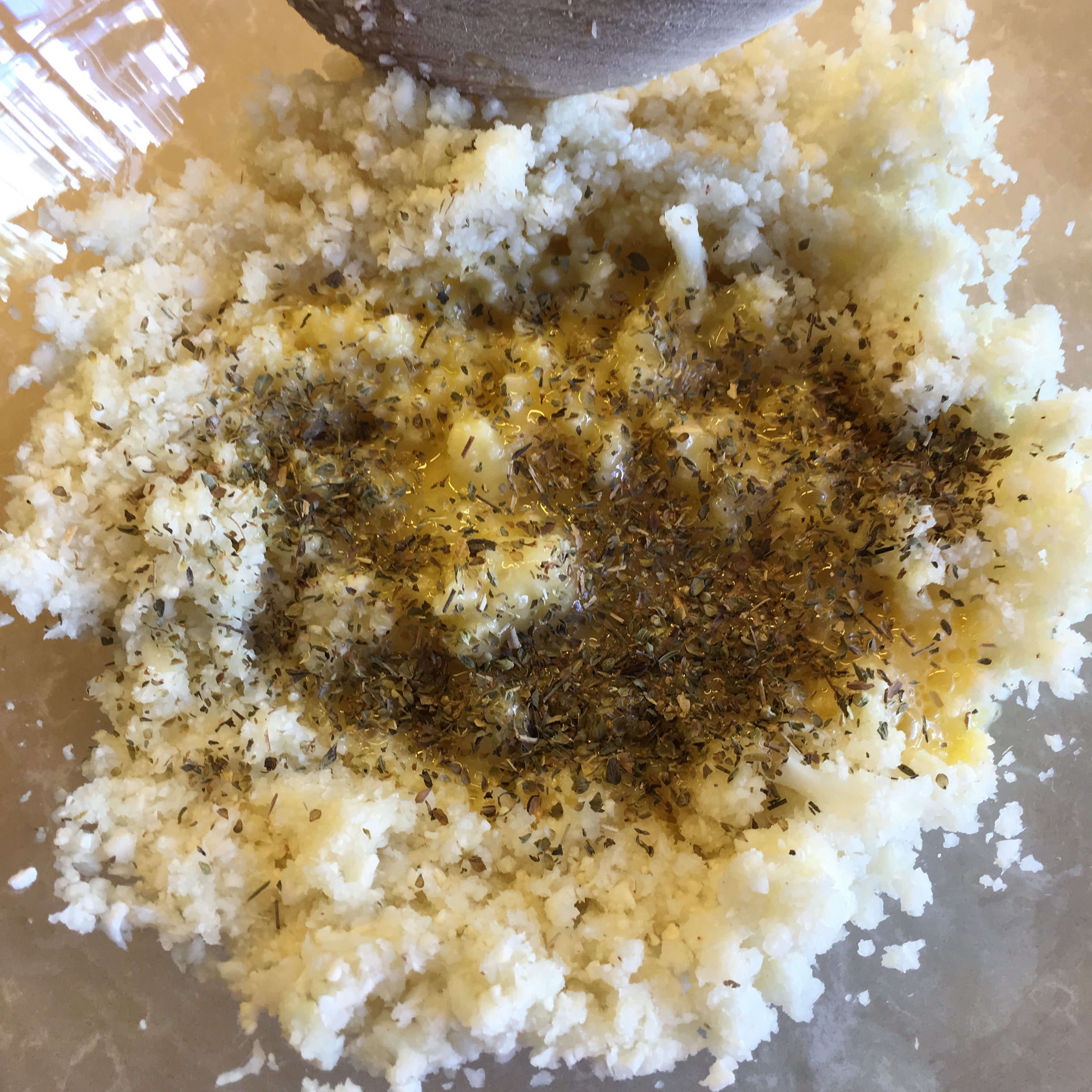 Juntar a couve flor com os ovos e a farinha de amêndoa. Caso esteva muito mole colocar mais farinha de amêndoa. Temperar com orégão.