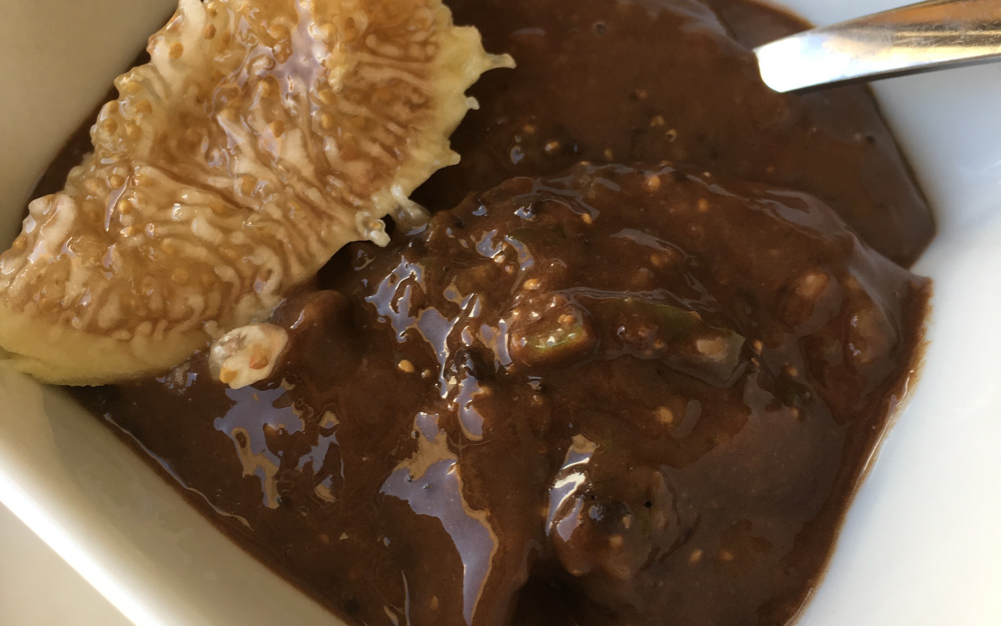 Juntar os figos e a farinha num robot de cozinha e triturar. Ir juntando a bebida de amêndoa até obter a consistência desejada. Podem precisar de mais ou de menos da quantidade indicada.