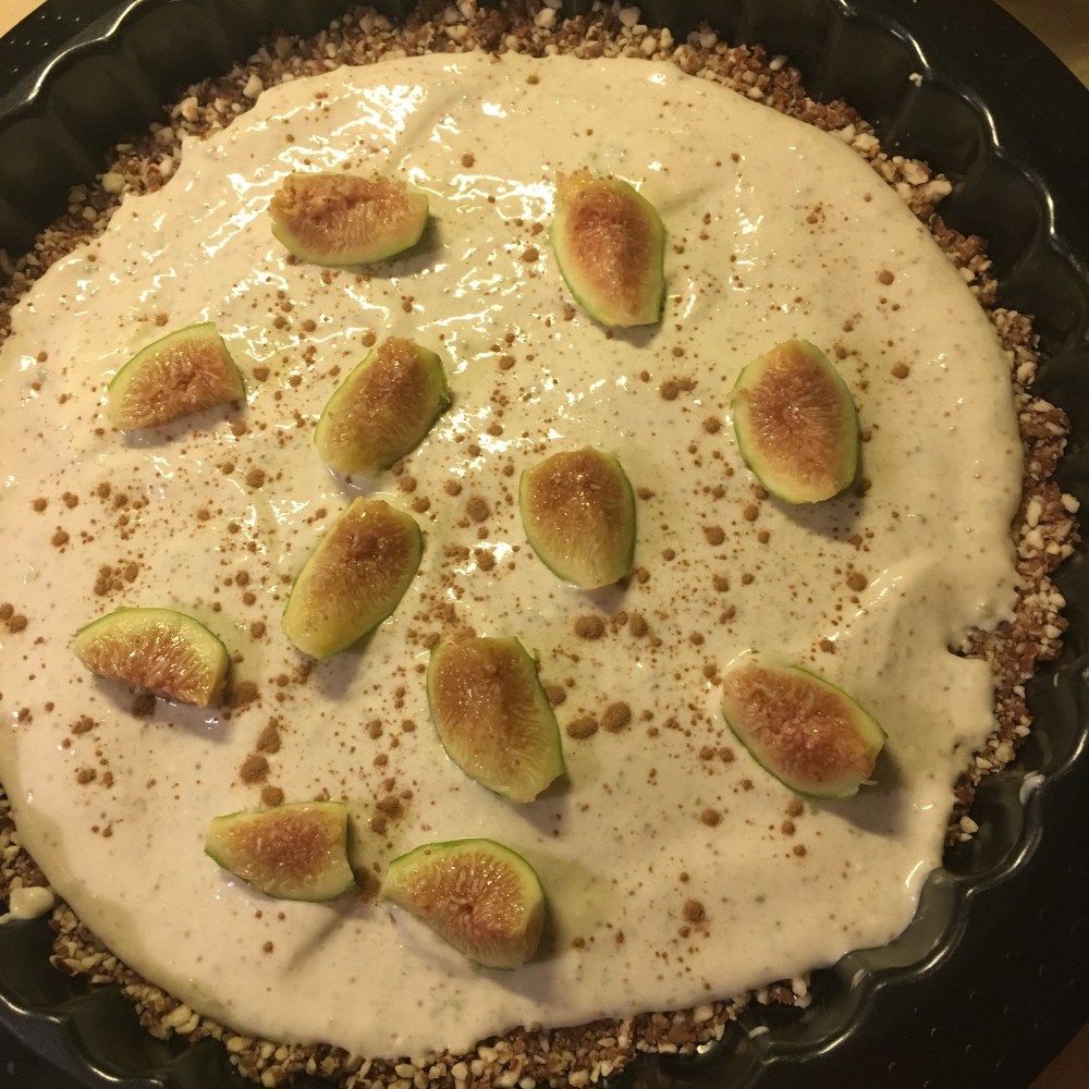 É só espalhar por cima da base, polvilhar com um pouco de canela e figos a decorar! Levei ao frigorífico (pelo menos uma hora) antes de servir.