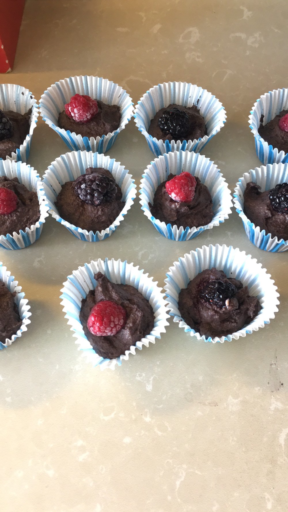 Distribui a massa pelas formas (mais ou menos 1 colher de sopa por forma) e colocar um fruto em cima a enfeitar.