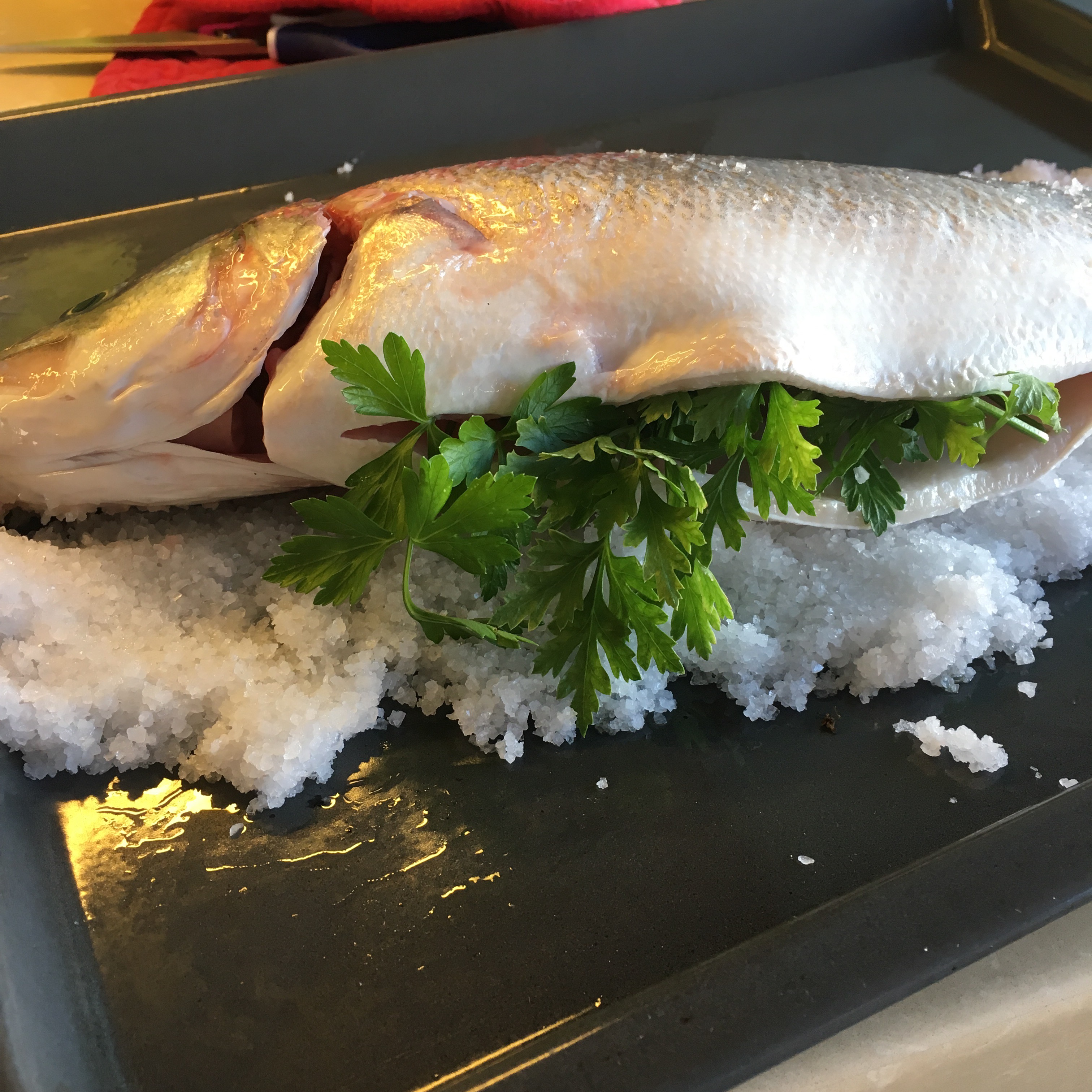 Colocar as ervas dentro do peixe e cobrir por completo com o restante sal.