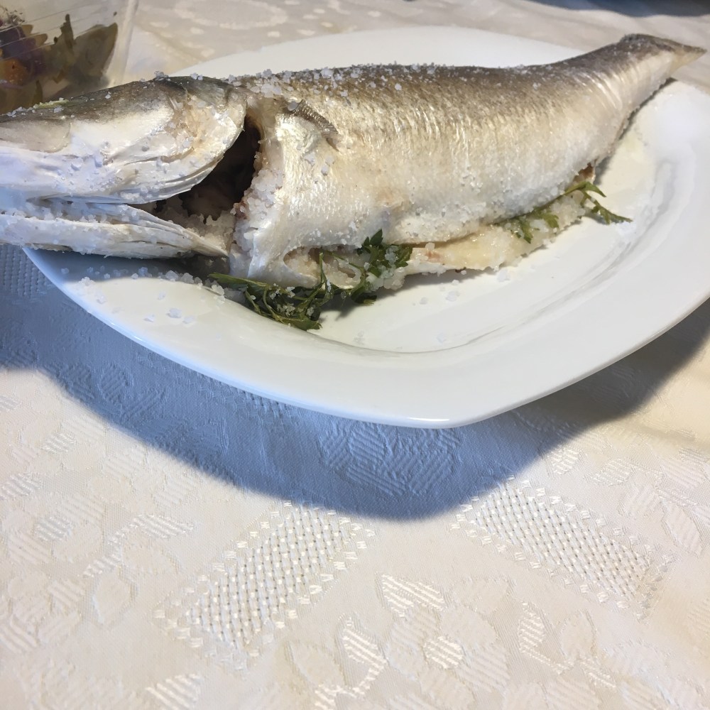 Robalo ou dourada! Tipicamente aos sábados ao almoço este é o nosso prato. Às 9:00 chega a entrega de peixe fresco. Só temos de preparar tudo, programar o forno e ir com as miúdas para a natação. Quando voltamos está pronto e é delicioso!