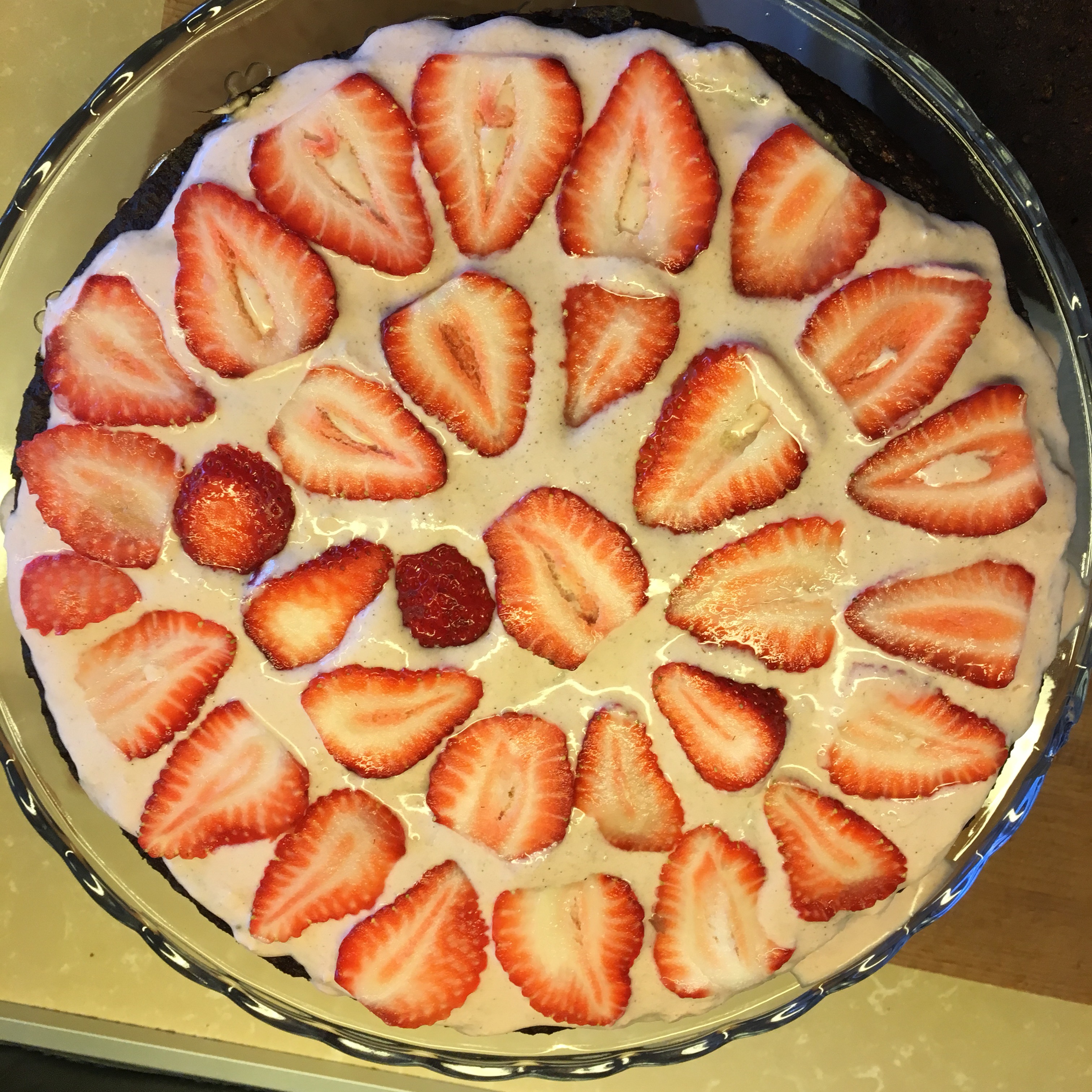 Colocar um dos bolos no prato de servir e colocar uma camada de cobertura. Generosa. Em cima distribuir morangos cortados finamente.