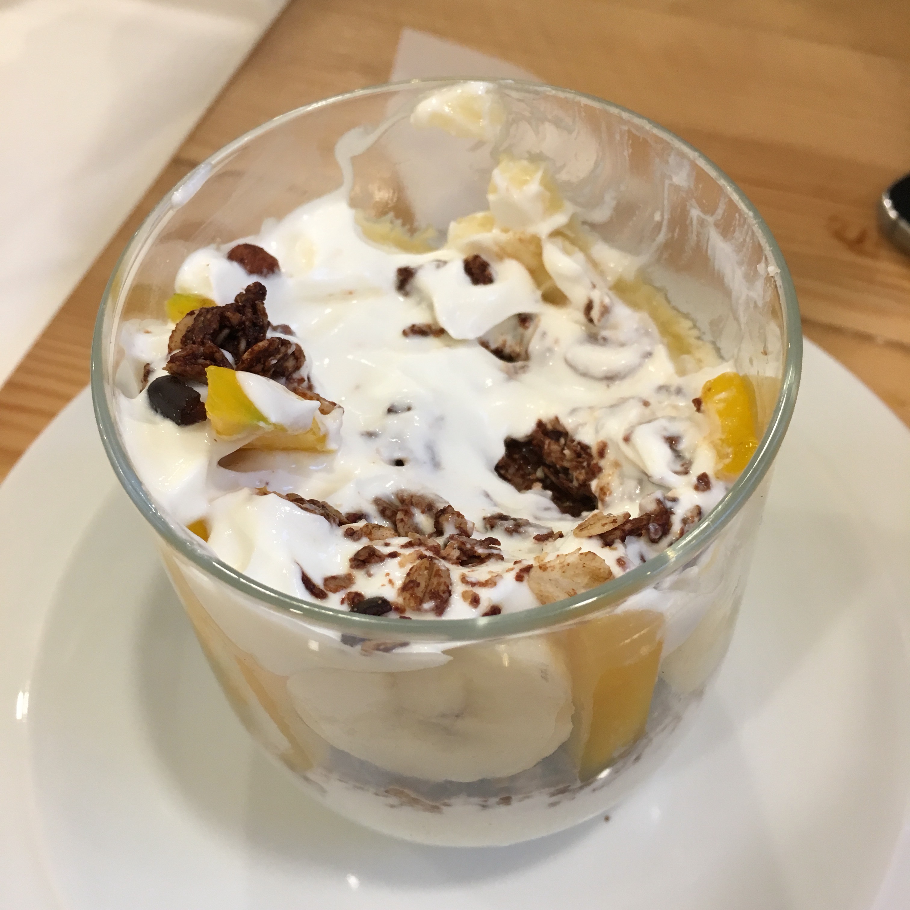 Para a baby M, que já começou a comer iogurtes, um parfait de iogurte grego com manga e banana e granola caseira de cacau (sem açúcar!). Ela que adora comer sozinha, mas iogurtes é com ajuda, abrir a boca e refilava à espera de mais. A dose era grande e deve ter “despachado” 1/3 sozinha. A mana ajudou em boa parte do resto. E os pais também!