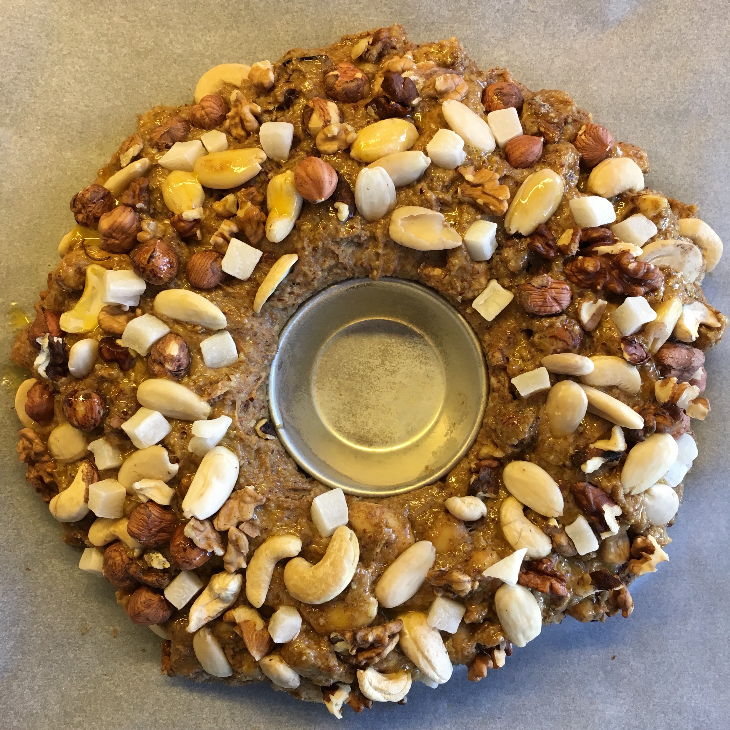 Colocar sobre uma base que possa ir ao forno forrada com papel vegetal. Formar uma rosca e colocar um recipiente que possa ir ao forno e não deixe fechar o buraco da massa (usei uma forma de queque). Picelar com uma gema de ovo e decorar com os restantes frutos secos e cubos de côco.