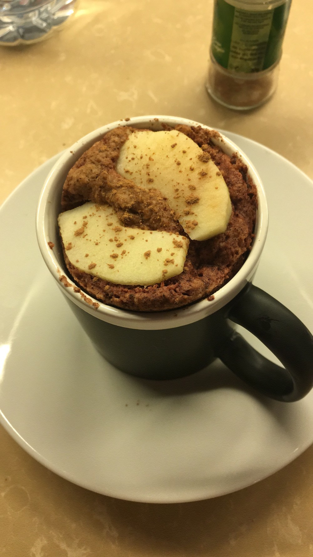 Depois é só colocar 2 fatias de maçã no fundo da caneca, deitar a massa e mais 2 fatias de maçã.