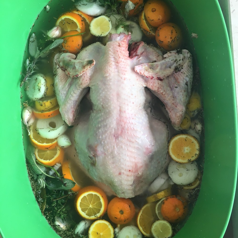 Numa bacia grande, onde caiba o peru praticamente submerso, colocar o peru e o líquido da salmoura coado. Juntar todos os ingredientes da marinada. Ir virando o peru de vez em quando (umas duas vezes por exemplo).
