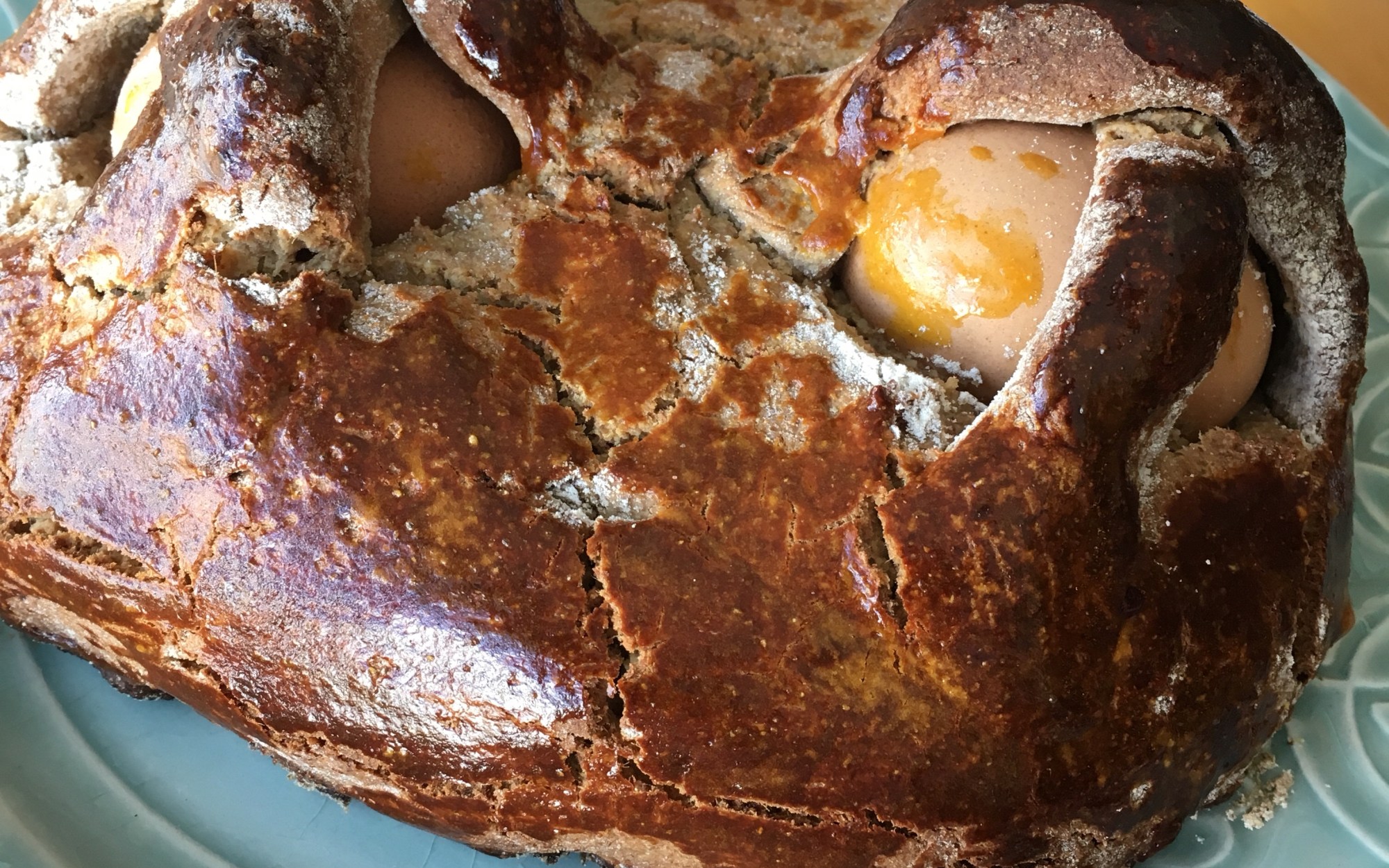 Depois de 2 tentativas (notem que a primeira estava bem saborosa, mas não um requinte de aspecto e precisava de mais tempo no forno), lá saiu o Folar com ovo da Páscoa!