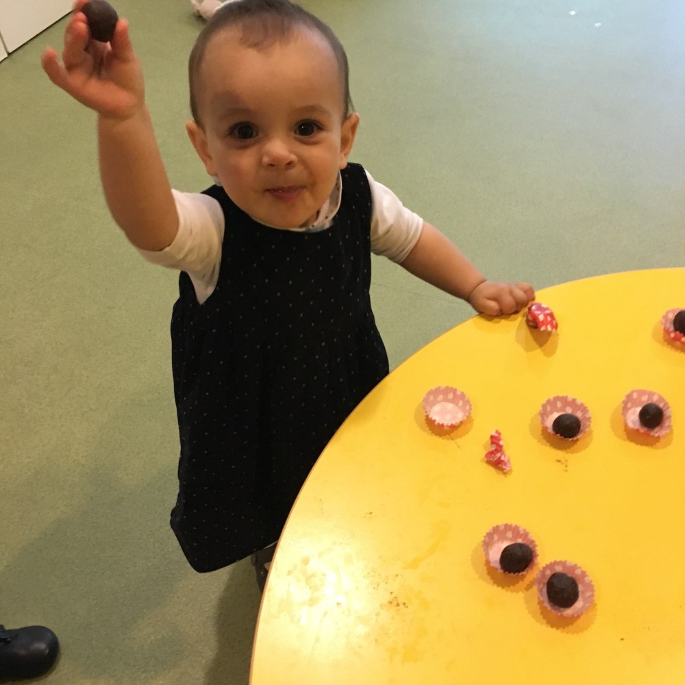 Para a baby M preparei “beijinhos de Mãe” (coloco a receita na próxima semana). Levei a massa pronta para que cada um fizesse bolinhas para a sua mamã. Houve quem apenas se preocupasse em comer e houve quem alinhasse nas bolinhas.