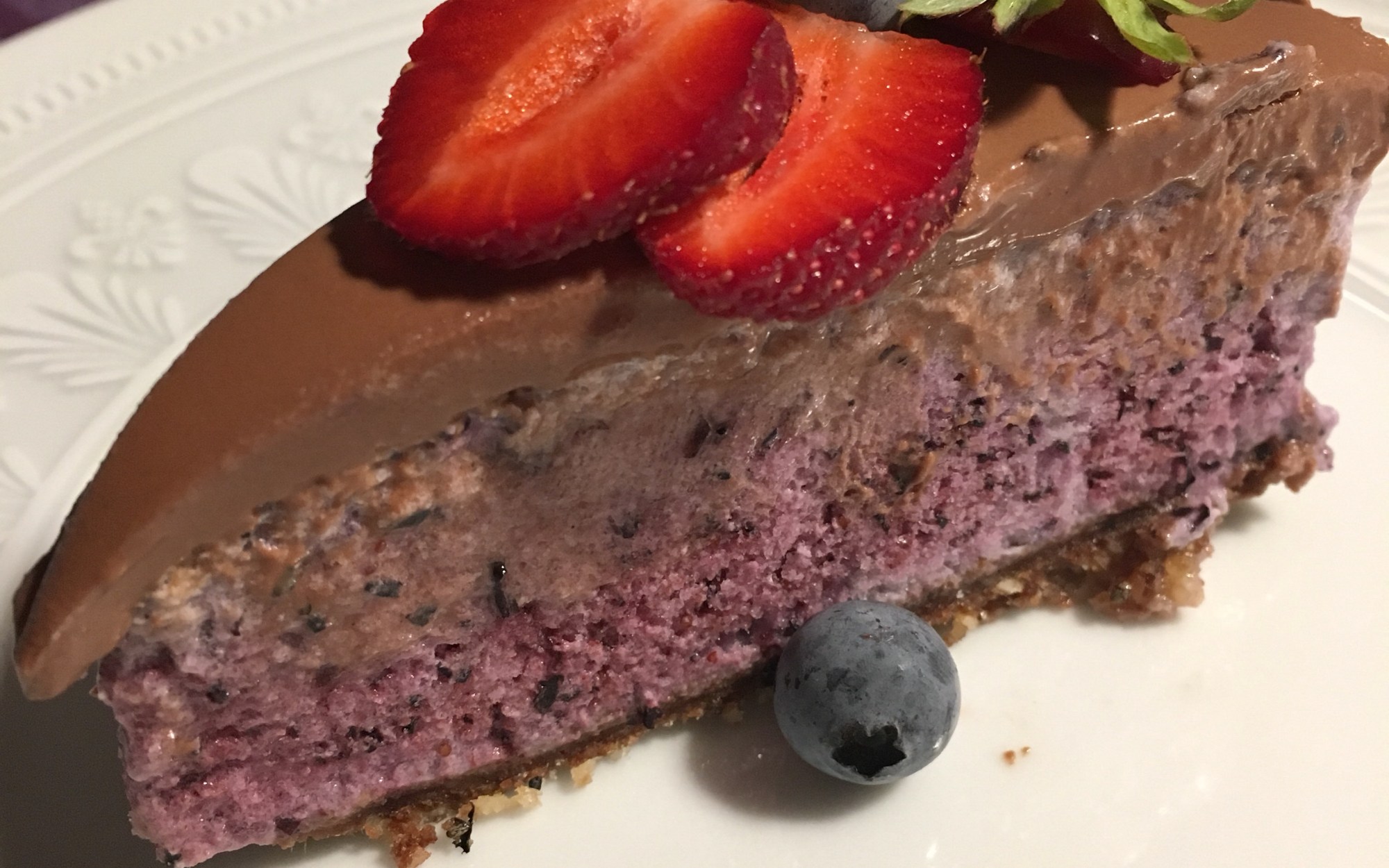 Juntar no mesmo robot de cozinha os mirtilos e os cajus e triturar uns 5 minutos em velocidade elevada. Até esta com aspecto de mousse. Colocar sobre a base e levar ao congelador por 1h30. Até servir.