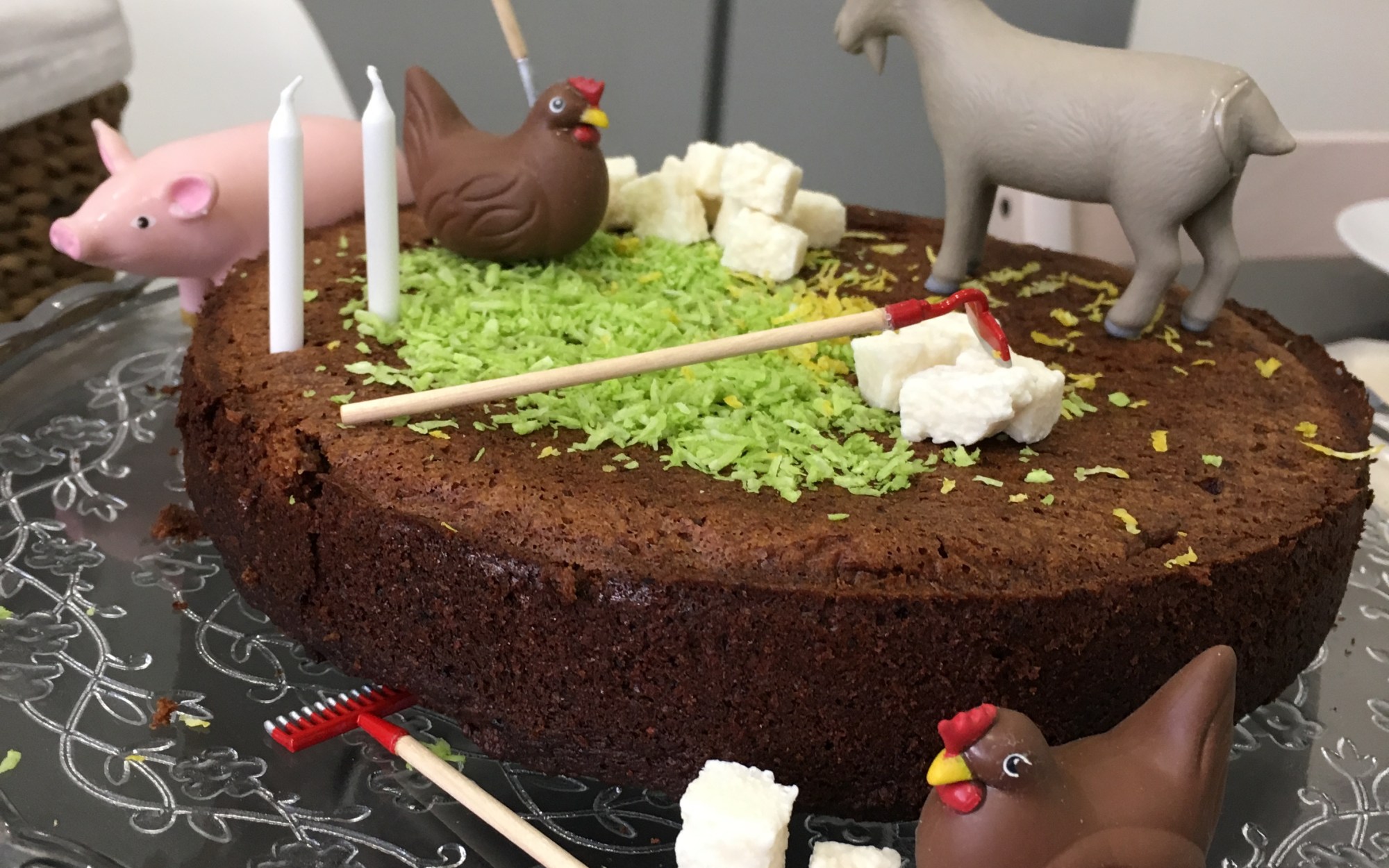 - Decoração: côco ralado tingido com sumo de espinafres, cubos de côco e animais da Quinta!