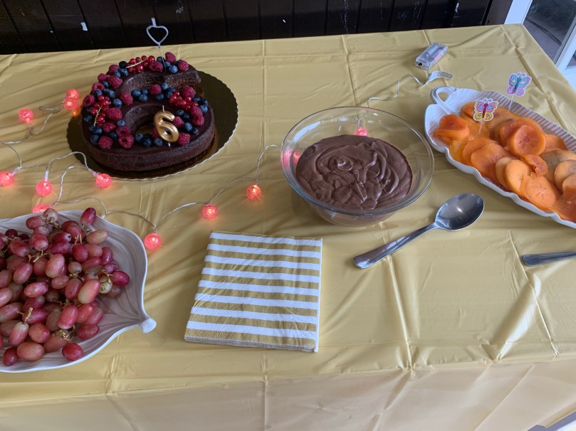 A sugestão para almoço foi de panados de frango e de hambúrgueres de atum. Os últimos quase voaram, os primeiros sobraram. Houve quem me perguntasse se tinha croquetes. E o ensinamento que tirei da festa foi: não interessa se é brunch, almoço ou lanche, os miúdos gostam de finger food. Uma coisa tipo panado (ainda que saboroso) é muito igual a almoço. Comeram os chips de batata doce (que acompanhavam os panados) e deixaram o resto.