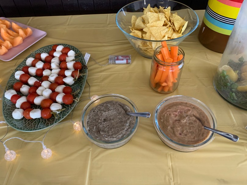 Espetadas de mozarella de bufala com tomate, patê de anchovas e guacamole da tia G (receita no livro), palitos de cenoura e chips de milho (comprei no Go Natural).