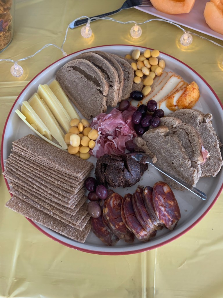 Tostas Finn Crisp Bio, Pão de centeio caseiro (receita no livro), marmelada, chouriço (comprei no Go Natural), presunto Parma, queijo da ilha, queijo de cabra de Nisa (comprei no Continente).