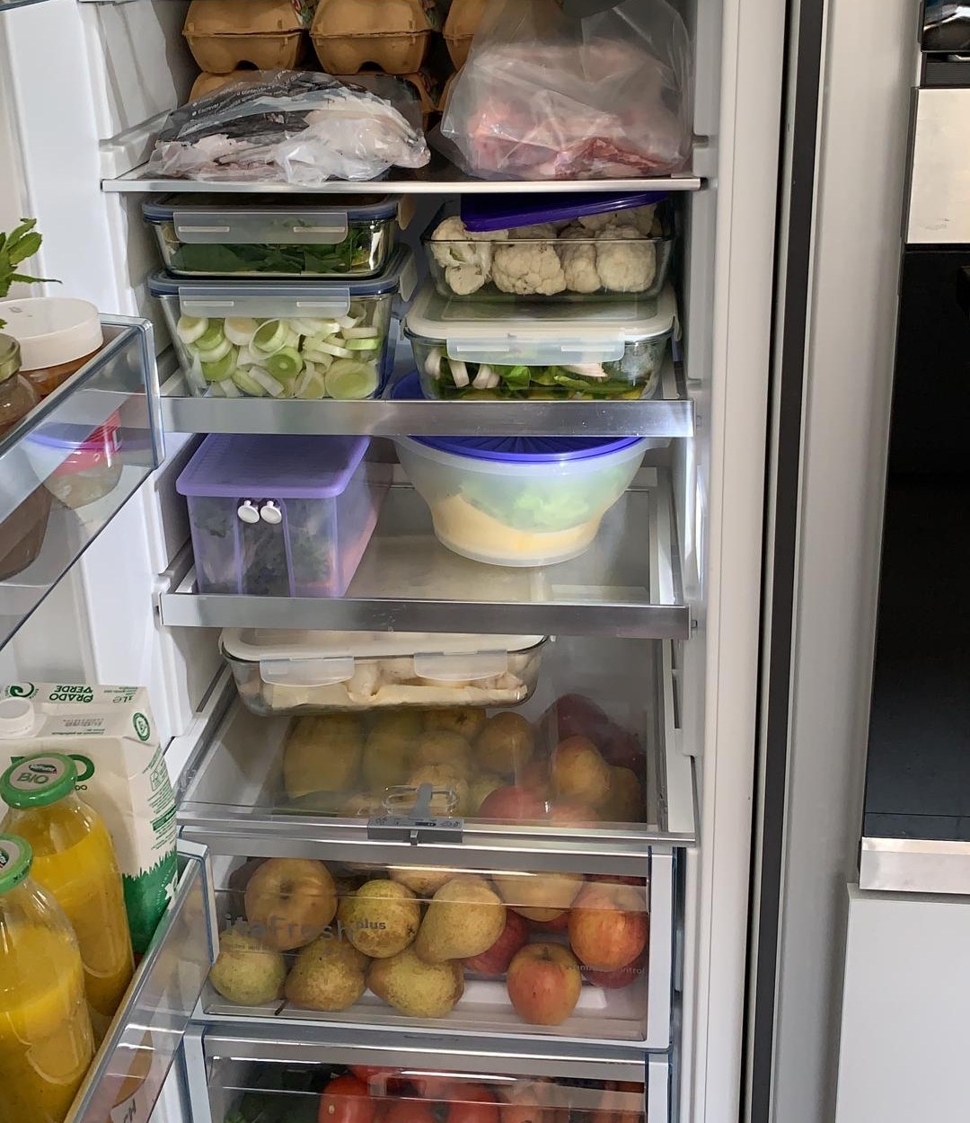 Depois, semanalmente faço uma compra de básicos on-line e de peixe fresco; de 2 em 2 semanas de cabaz de frescos; e de mês a mês de talho.